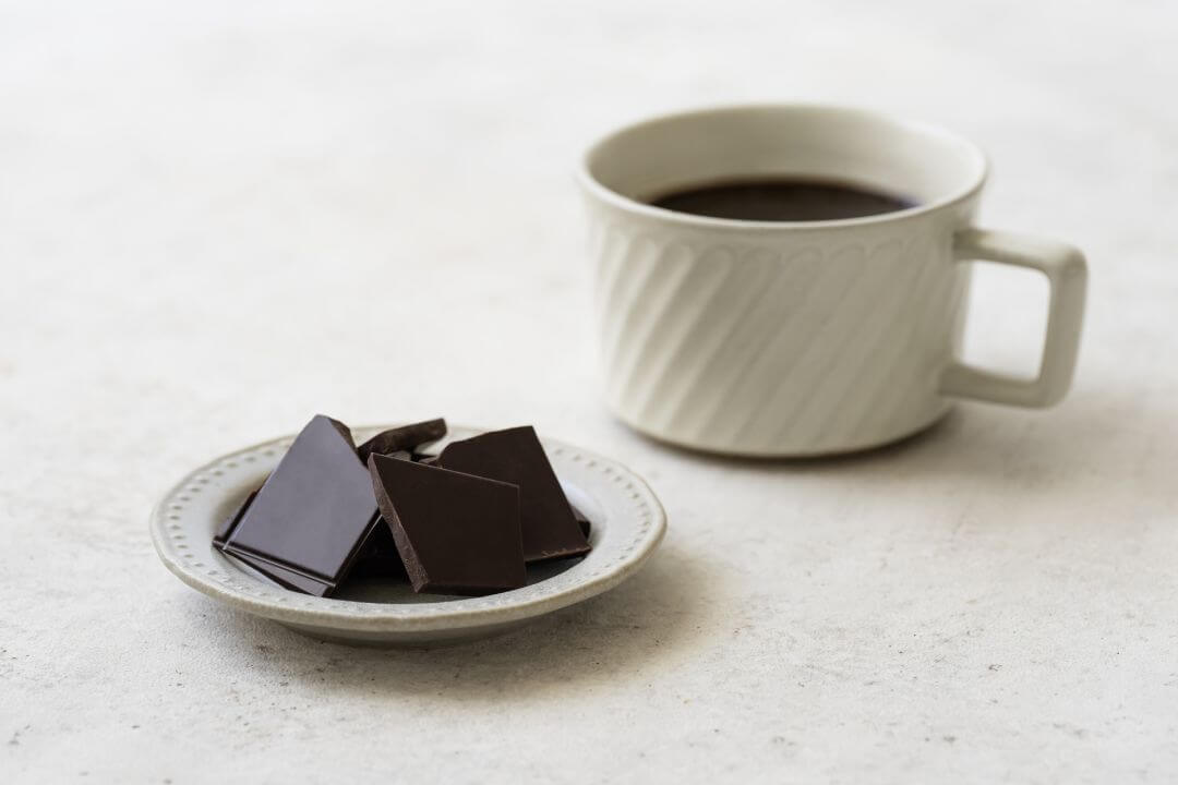 意外な落とし穴として見落としがちなのがチョコレートです。特に高カカオのチョコレートにはコーヒーと同等かそれ以上のカフェインが含まれています。